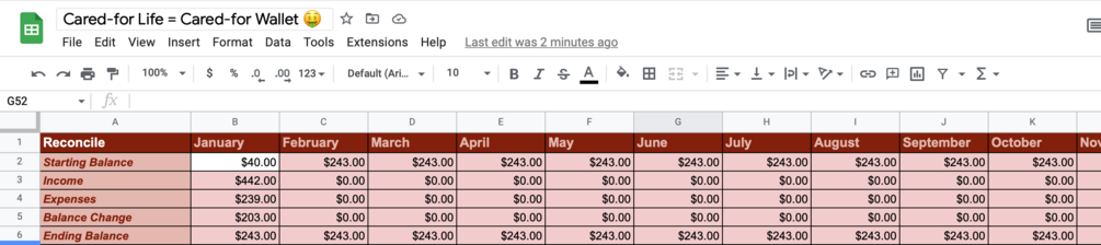 - Incomes: where you can add up all you've gotten over the month (The incomes cells of the specific areas can be altered, but do not alter the darker shaded ones.)
